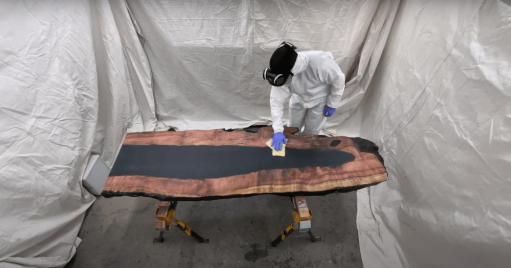 Inside of a collection of high quality sheets, sporting a full body suit: it was time to discover what DIY spraying was all about. To see the entire DIY spray process, complete with ultimate patience, the frustration of micro debris, and a triumphant success: watch here. Many coats of spray later: the table was looking fantastic.
