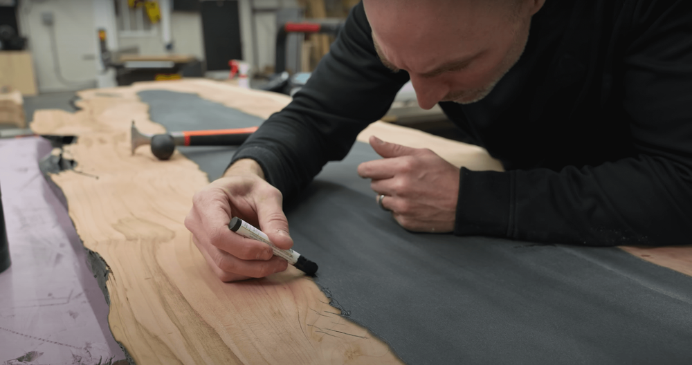 After choosing the better half of of the redwood slab, Goby Walnut’s specialists planed andthe wood’s surface with their wide belt sander. With the wood at home, it was time to make a rough chalk outline for the table.